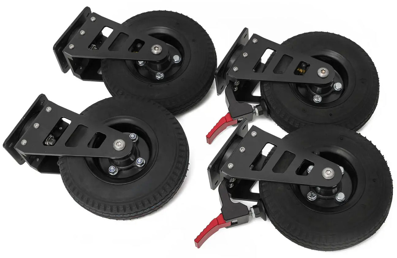 Das adicam 9" Premium Wheel System verfügt über zwei feste und zwei schwenkbare Räder mit eingebauten Fußbremsen, die den Wagen perfekt stabil und sicher halten. Die Halterungen sind aus Aluminium gefertigt, um sie leicht, stabil und langlebig zu machen. Sie sind 15 % leichter als unsere Standardlösungen aus Stahl, bei gleicher Tragfähigkeit. Optional können die festen Räder durch Lösen von zwei Feststellschrauben in Schwenkräder umgewandelt werden, und wenn Sie möchten, können Sie eine zusätzliche Bremse separat erwerben, mit der alle Räder gebremst werden können. Die Räder der neuen Version passen auf alle Modelle der adicam-Wagen. Jedes Rad wird mit einer Radtasche zum Schutz geliefert.