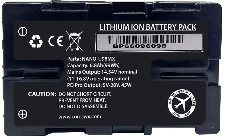 98-Wh-M-Snap-Pack für ausgewählte Sony-Kameras und BMD PyxisDer Nano-U98MX 14,8-V-Akku von Core SWX ist ein kompaktes Kraftpaket, das für Benutzer von Sony-Camcordern und Blackmagic Design Pyxis entwickelt wurde, die zuverlässige und vielseitige Energielösungen benötigen. Mit einer Kapazität von 98Wh und fortschrittlichen Ausgangsoptionen - einschließlich P-Tap und PDPro USB-C PD - kann dieser Akku gleichzeitig Ihre Kamera und wichtiges Produktionszubehör mit Strom versorgen, was ihn zu einem unverzichtbaren Werkzeug für professionelle Shooter macht.