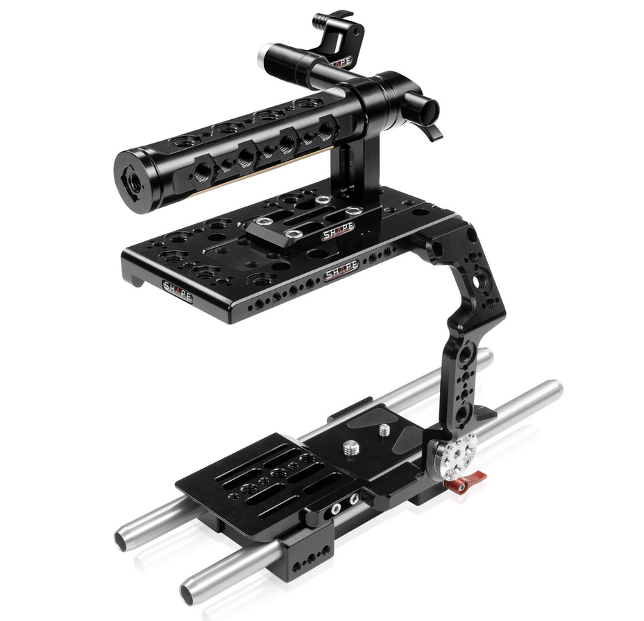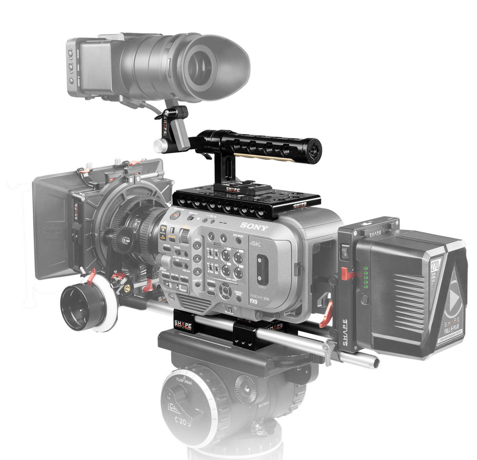 Ergänzen Sie Ihre Sony PXW-FX9-Kamera mit Zubehör und Handheld-Funktionalität mit diesem Rig-Kit von SHAPE. Es umfasst eine Grundplatte mit 15-mm-Stangensystem, eine formschlüssige Seitenplatte mit Arri-Rosette, eine obere Platte, eine hintere Einsatzplatte, einen oberen Griff mit mehreren Gewindelöchern und eine Sucherstangenklemme mit 19-mm-Druckknopf. Die Grundplatte passt auf das optische Zentrum der Sony FX9 und kann auch auf einem Stativ montiert werden. Die hintere Einsatzplatte wird an der Rückseite der Kamera befestigt, um sie auf der Grundplatte zu stützen. Die 15-mm-12-Zoll-Stangen ermöglichen die Montage von zusätzlichem Zubehör.