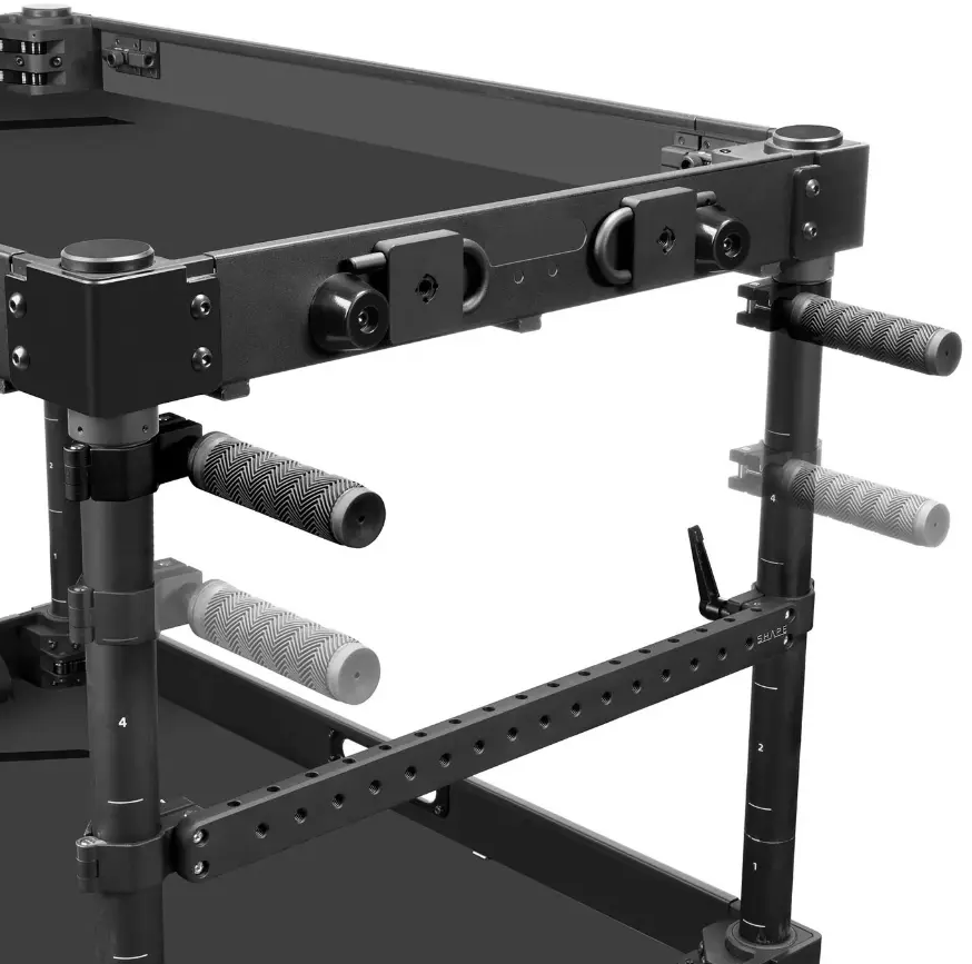 - Zwei höhenverstellbare Querstangen mit 3/8''-16-Gewindebohrungen zur Befestigung von Zubehör, die an Aluminiumpfosten mit eindeutigen Höhenmarkierungen angebracht werden