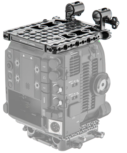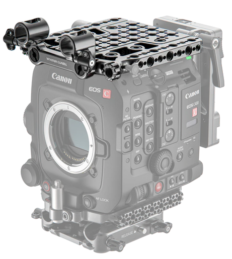 Die Center Top Plate wird an den mittleren Befestigungspunkten des Kameragehäuses angebracht, so dass Sie den oberen Handgriff der EOS C400 entfernen und 3/8"-16- und 1/4"-20-Befestigungspunkte für anderes Zubehör oder Handgriffe wie den Ultra Handle 5" Kit hinzufügen können.