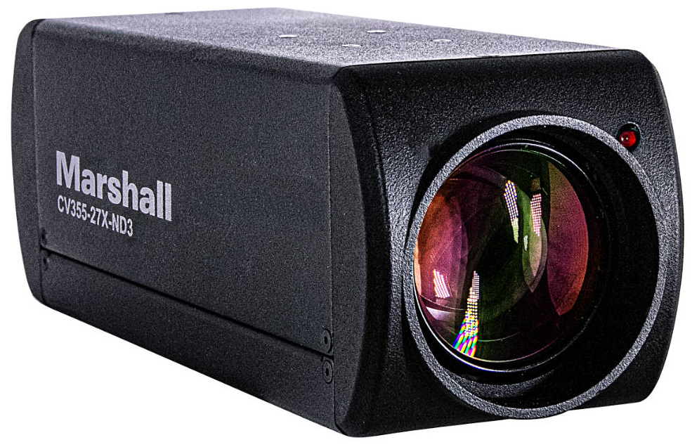 The CV355-27X-ND3 27X optical zoom NDI® (NDI HX2, NDI HX3) camera utilizes a professional grade 8.5-megapixel sensor to capture crisp FHD video up to 1920x1080 at 60fps with support for all FHD formats. Marshall's straight forward design and ease of use make this camera a valuable tool in a wide variety of broadcast and professional A/V applications.