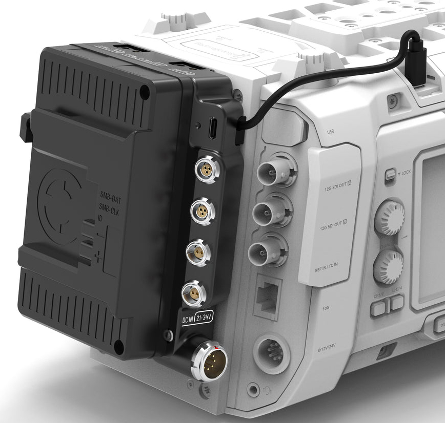 The included USB-C cable can be installed inside DB-12 and connected to the top-rear port on the camera body to enable remote start/stop capability using 3-pin Fischer devices. Hot-swap between on-board battery and 8pin LEMO compatible connector without losing camera or accessory power. When both sources are connected, the DC INPUT takes priority down to 22.8V at which point, the DB-12 will switch to an onboard battery.