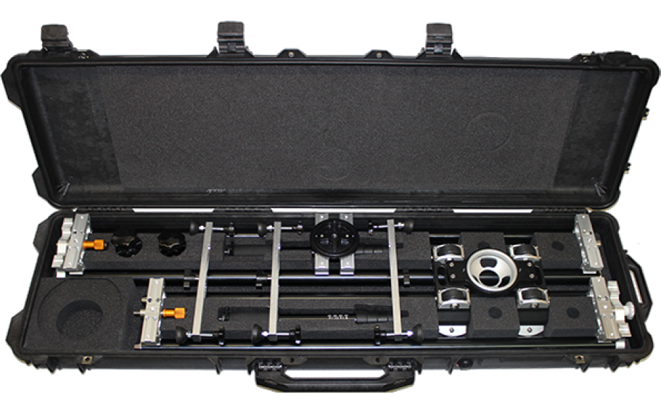 The Tango Pelicase Kit includes a 1M and 1.2M track length, which is provided with a central tripod adapter, 1 Dolly, 2 Magnetic end stops, 3 Tango Floor Spreaders with levelling feet, 1 Universal Tie-down for any fluid head and 2 adjustable Mono-pods. Everything is packaged in a Pelicase with special hard foam.The whole package weighs no more than 22 kg.