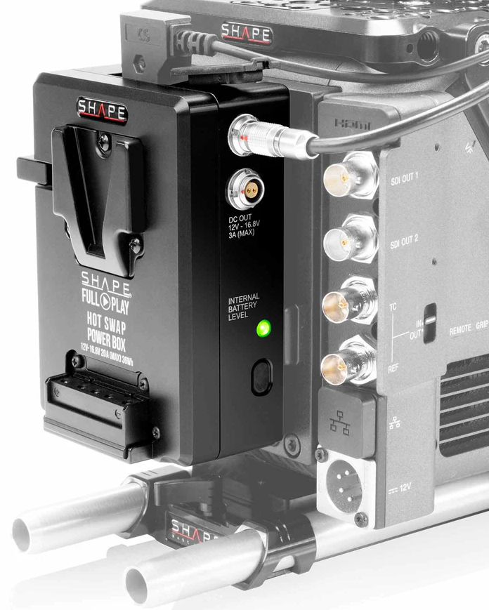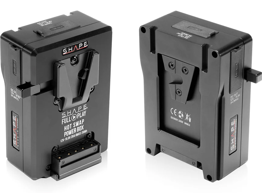 SHAPE is a Hot Swap V-Mount Power Box battery, designed for uninterrupted power supply. Its main goal is to maintain power to the camera, during a battery switch. It will prioritize external batteries for power supply while simultaneously charging the internal battery.