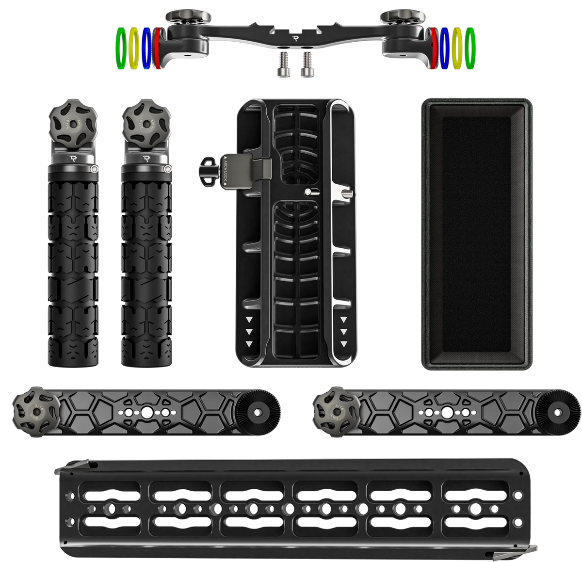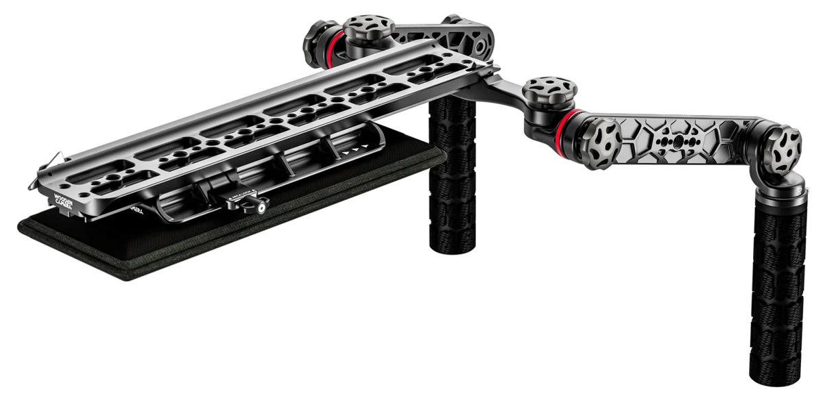 The Shoulder Rig is ergonomically designed for comfortable, extended use, minimizing fatigue and maximizing efficiency. The flat shoulder pad allows you to adjust the balance of the build on your shoulder, allowing you to easily shift the weight to the optimal position. Its modularity allows extensive customization for various shooting scenarios and accessory integration. The intuitive design ensures ease of use and streamlining workflows. The kit includes a Safety Dovetail, Crossbar, ARCA Shoulder Plate, Shoulder Pad, 6” Extensions, Rosette Handgrips, and Color Rings. All components are made from 7075 Aluminum for maximum strength in tough shooting conditions.