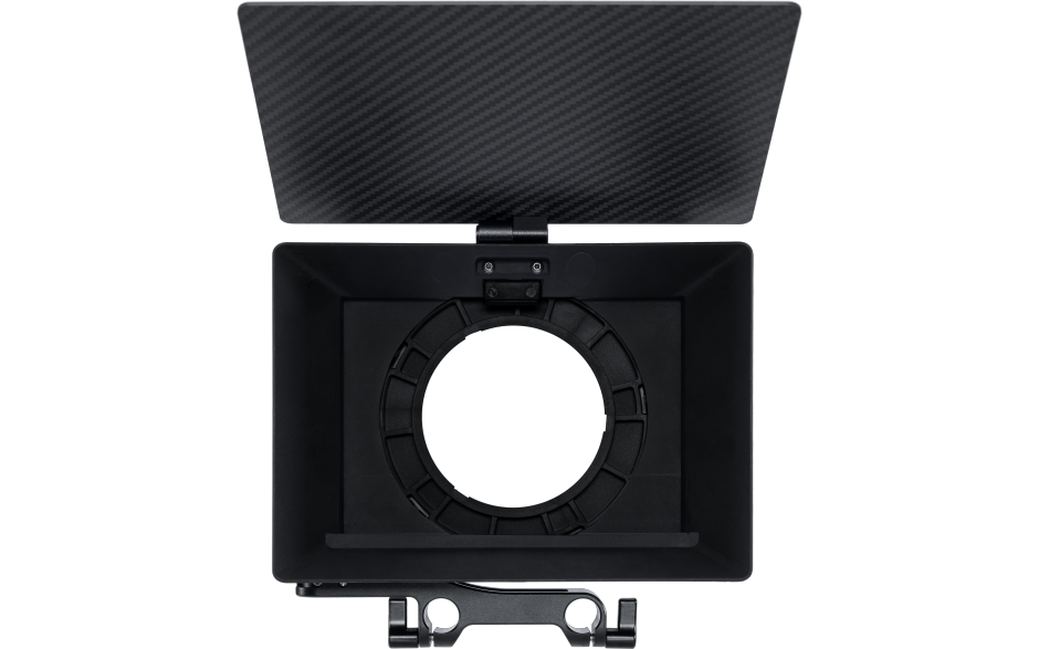 Top flag is made of lightweight carbon fiber and covers the front of the mattebox which is great for protecting the lens between takes. The flag can be removed by loosening the top thumbscrew, aligning the tab with the key slot, and pulling out.