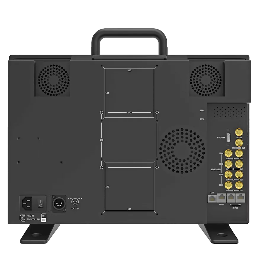 Zawiera wejście 12G-SDI (x4), wyjście 12G-SDI (x4), wejście referencyjne (synchronizacja zewnętrzna), wejście HDMI 2.0, wejście SFP (x2) i przetworzone wyjście monitora. Rozmiar 18,4", rozdzielczość 3840 x 2160 (16:9), rozstaw pikseli 0,035(H) x 0,1065(V) mm, głębia kolorów 1,07B kolorów