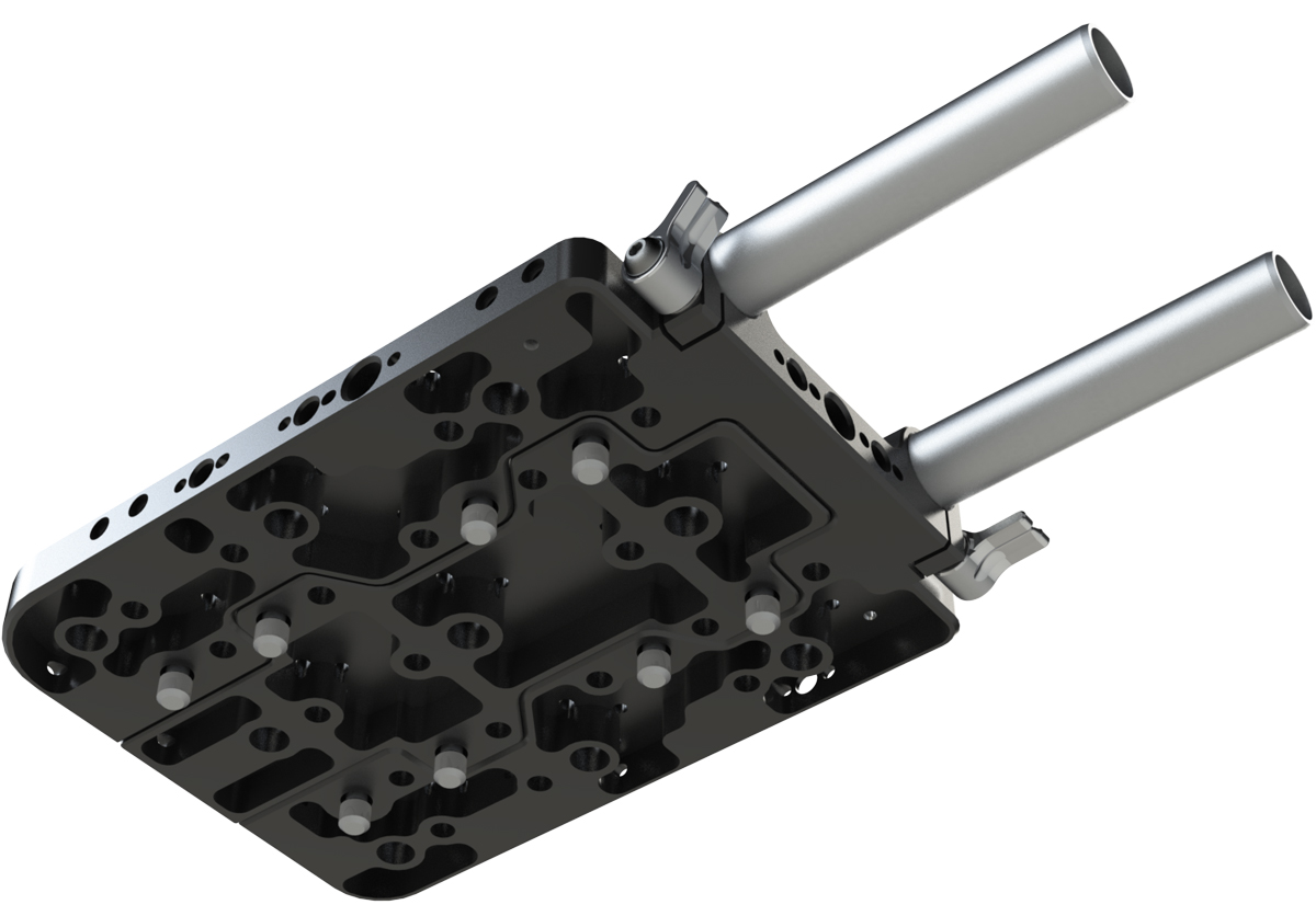 The Top Plate comes with rod support in standard optical height, numerous 3/8″ & 1/4″ fastening points with ARRI anti-twist safeguard and an optical marker for attaching a measuring tape. Additionally the top plate inherits various mounting points to move the Sony Burano cable clamps to the desired position.