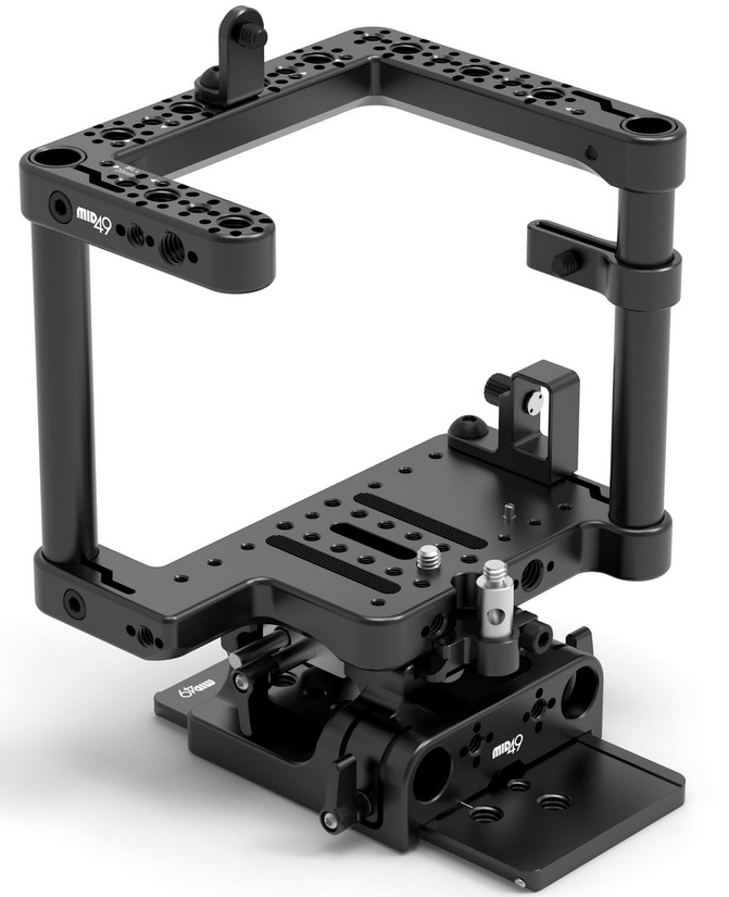 Form-fitting cage with 1/4-20, 3/8-16, and M4x20mm ARRI MAP threaded holes in several places. HDMI lock with reduction inserts protects the camera's HDMI port from abuse. Left side camera tie-down keeps the C50 from tipping under the force of focus motors. Rear handle tie-down adds stability to the handle-body connection when using heavy lenses. Lower ARCA Swiss dovetail attaches to the included baseplate, and the adjustable lens support adapter with 3 lengths of 1/4-20 support screw attaches to 3rd party lens adapters like Metabones, etc.