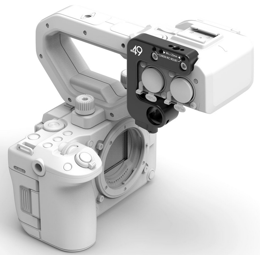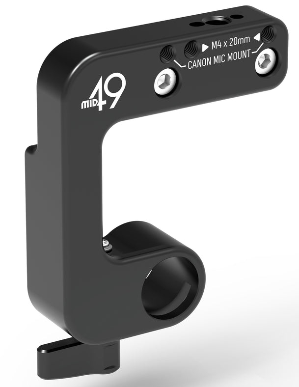 Canon C50 15mm Rod Clamp attaches to the two M4 holes on the front of the handle where the microphone shockmount would normally be installed. M4 holes are available to stack the Canon shockmount on top of the bracket. M4x20 ARRI MAP holes and an ARRI 1/4-20 are also available for additional mounting.