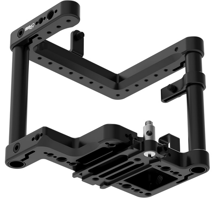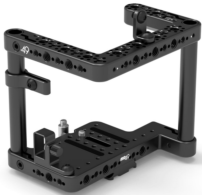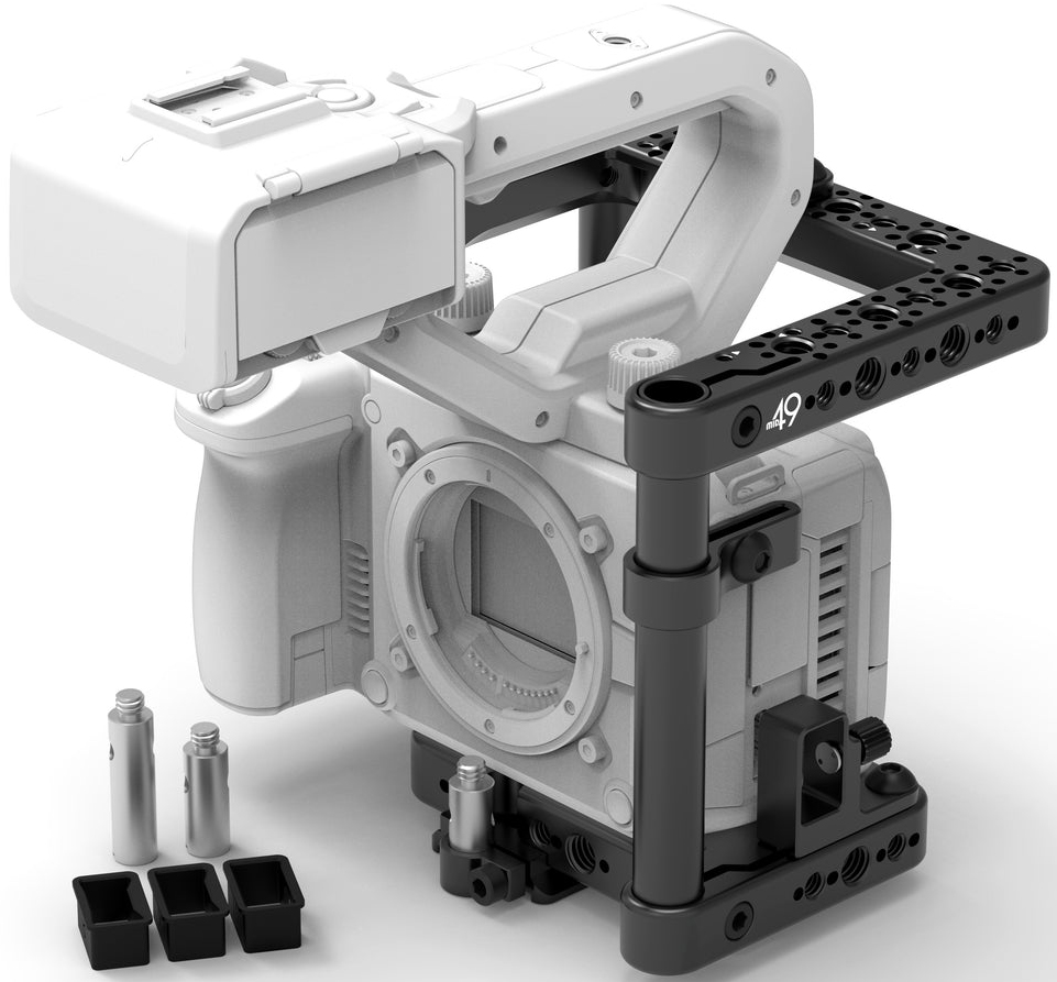 Upper Cage for Canon C50 is a form-fitting cage with 1/4-20, 3/8-16, and M4x20mm ARRI MAP threaded holes in several places. The included HDMI lock with reduction inserts protects the camera's HDMI port from abuse.