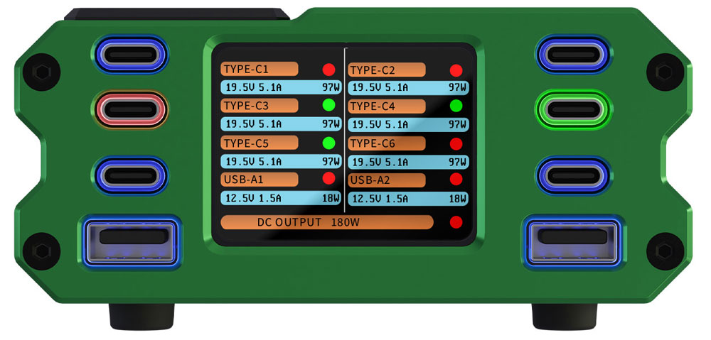 - Connections: 6x USB-C, 2x USB-A, 1x DC