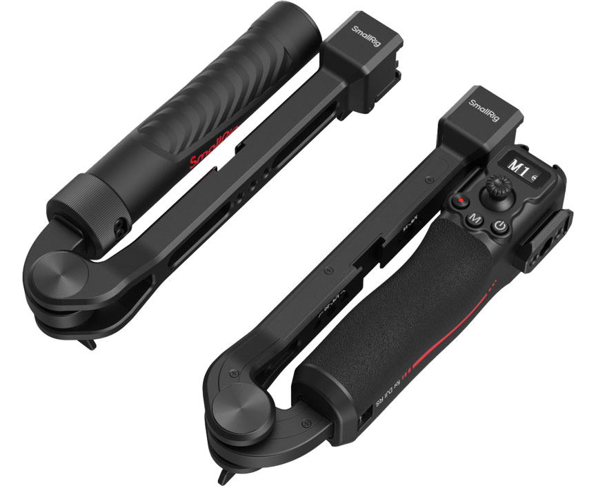 The handles feature various mounting options, including 1/4"-20 threaded holes, 3/8"-16 locating holes, a cold shoe mount, a NATO rail, a QD socket, and strap slots. This allows for the attaching of SmallRig V-mount battery plates 2801 & 2988, providing a long-lasting power supply for both the stabilizer and the camera. The handles support inverted use and offer flexible angle adjustment for effortless shooting.