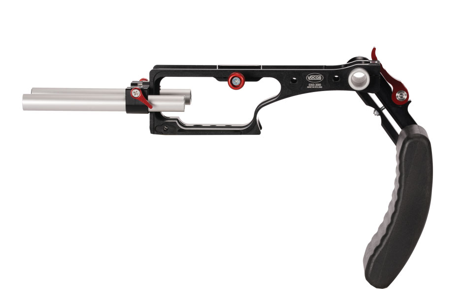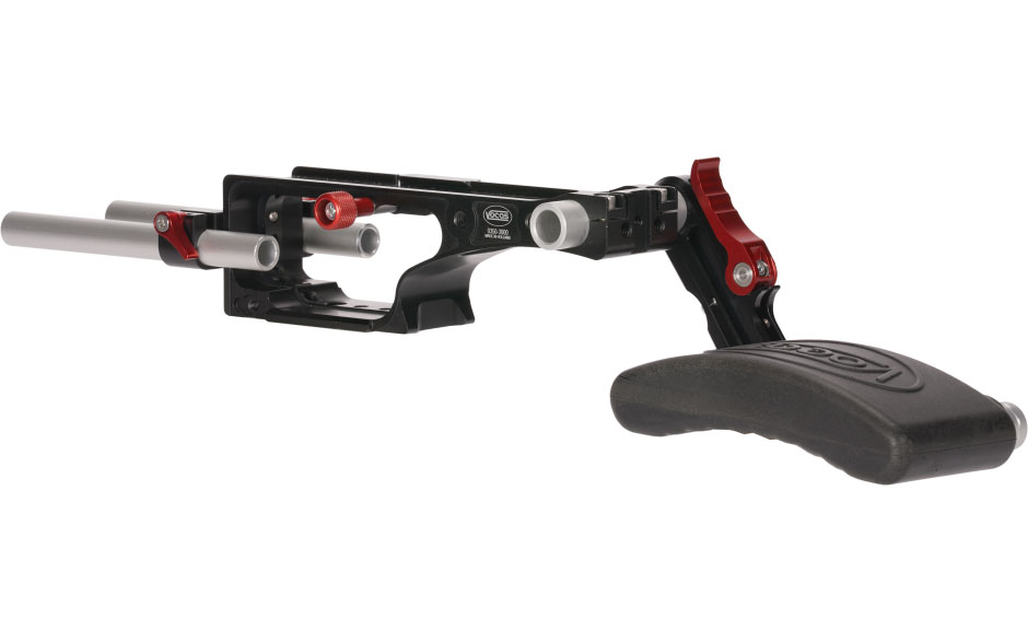 On the right rear end, the shoulder pad is attached to the rig via an extender to a horizontal 19 mm tube. The quick lock lever of the extender enables you to set the shoulder pad quickly in many different positions. For instance, the shoulder pad can be used directly underneath the rig for a comfortable shoulder setup, or into a compact chest support setup. Furthermore, the position of the shoulder pad can be set about 100 mm backwards, while adjusting the angle of the shoulder pad as well.