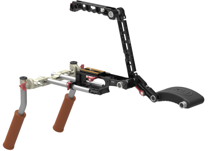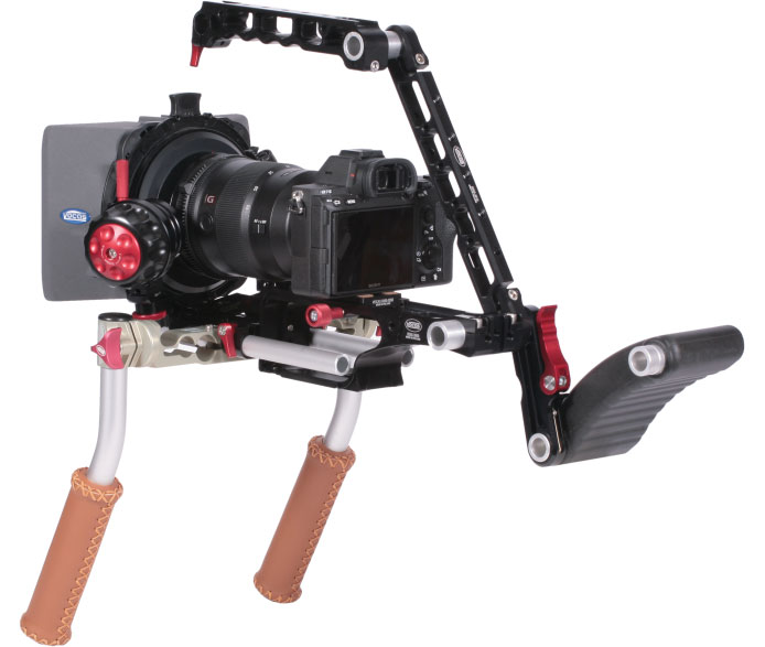 FCR-15 Advanced kit consisting of the flexible camera rig FCR-15 (0350-3000), the FCR-15 top handle (0350-3010) and the leather handgrip kit (0390-0002). The Advanced kit is compatible with a wide variety of cameras and is recommended for cameras without a proper tophandle and to which a third party viewfinder or LCD needs to be mounted.