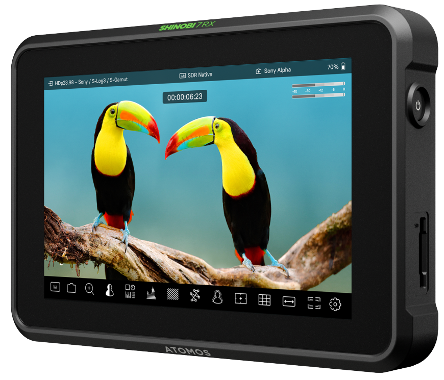 Shinobi 7RX łączy w sobie duży 7-calowy wyświetlacz HDR o szczytowej jasności 2200 nitówi lekkie funkcje linii Shinobi. Zaprojektowany do użytku w najjaśniejszych środowiskach, obsługuje sygnały wideo do 4Kp60 przez HDMI lub HDp60 przez 3G-SDI. Dzięki złączu USB-C umożliwia sterowanie kamerami Canon, Fujifilm, Nikon, Panasonic i Sony, a także Z CAM za pośrednictwem opcjonalnego kabla szeregowego USB-C. Wbudowana łączność Wi-Fi łączy monitor z bezprzewodowym systemem wideo Atomos TX-RX lub przesyła strumieniowo przez RTSP H.264, co czyni go idealnym monitorem reżyserskim, monitorem do ustawiania ostrości lub wyświetlaczem programu/podglądu.
