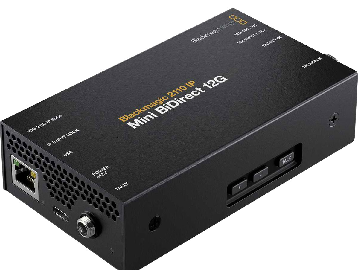 Blackmagic 2110 IP Mini BiDirect 12G umożliwia konwersję kamer telewizyjnych z połączeniami SDI do systemów wideo IP SMPTE-2110. Jego połączenie 12G-SDI obsługuje standardy SD, HD i Ultra HD do 2160p60, a nawet obsługuje powrót programu SDI. Blackmagic 2110 IP Mini BiDirect 12G posiada również 5-pinowe złącze słuchawkowe XLR talkback z regulacją głośności talkback i przyciskiem push to talk. Łączy się i zasila z sieci Ethernet 10G lub dołączonego zasilacza DC.