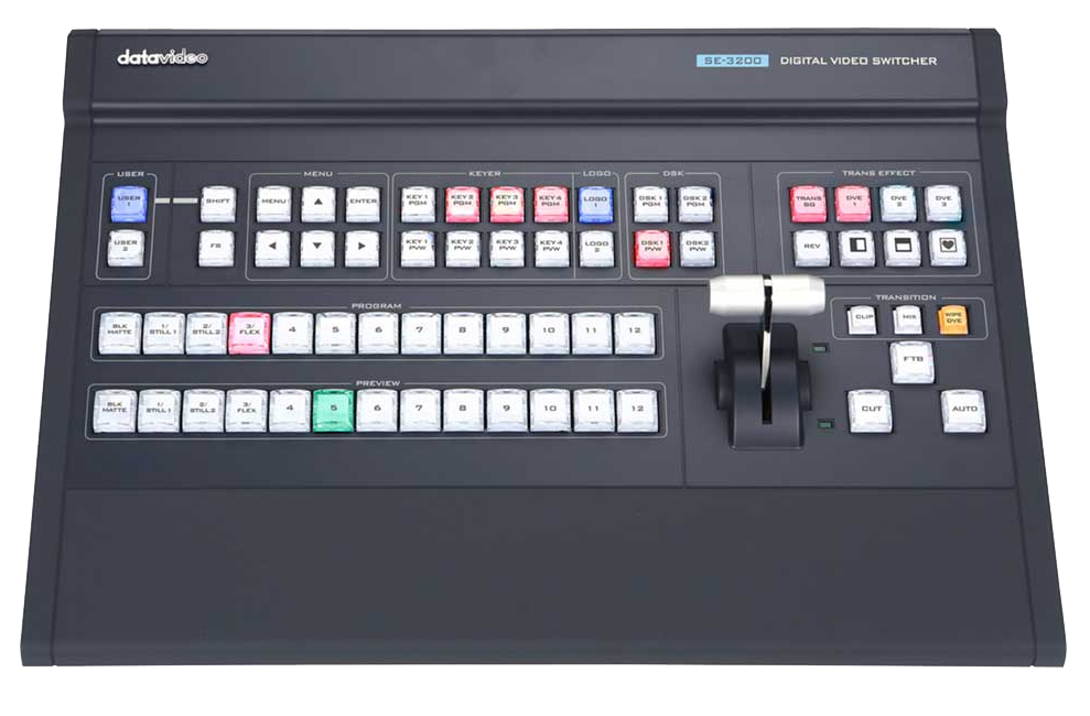 DataVideo SE -3200 to lekki switcher, którego jednostkę główną można zamontować w 19-calowej szafie rack. Panel klawiatury sterującej można umieścić na płaskiej powierzchni lub zabudować wewnątrz wozu transmisyjnego. Switcher SE-3200 posiada również potężne, łatwe w użyciu efekty, takie jak Chroma / Luma Key, DSK, PIP, DVE / Wipe Generator, still stores i wstawianie logo.