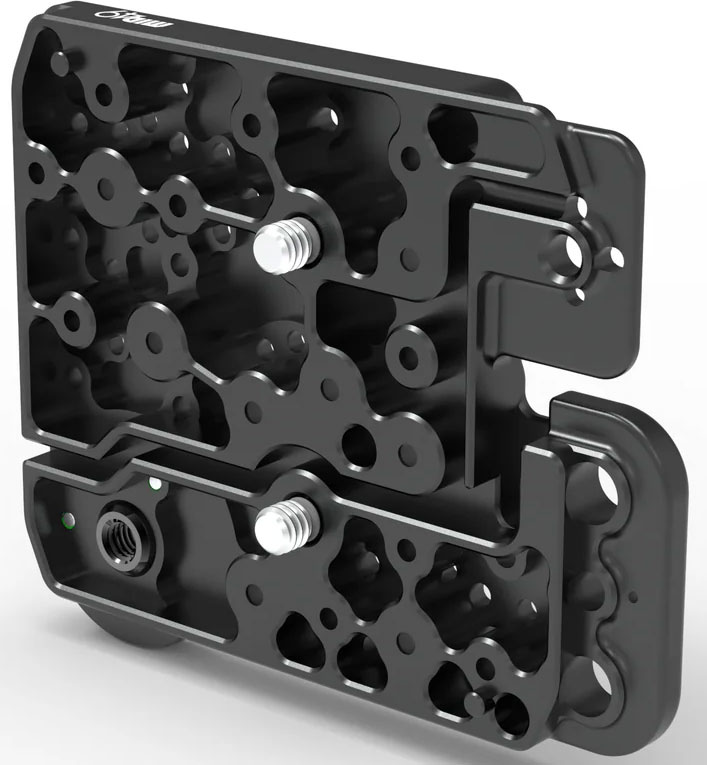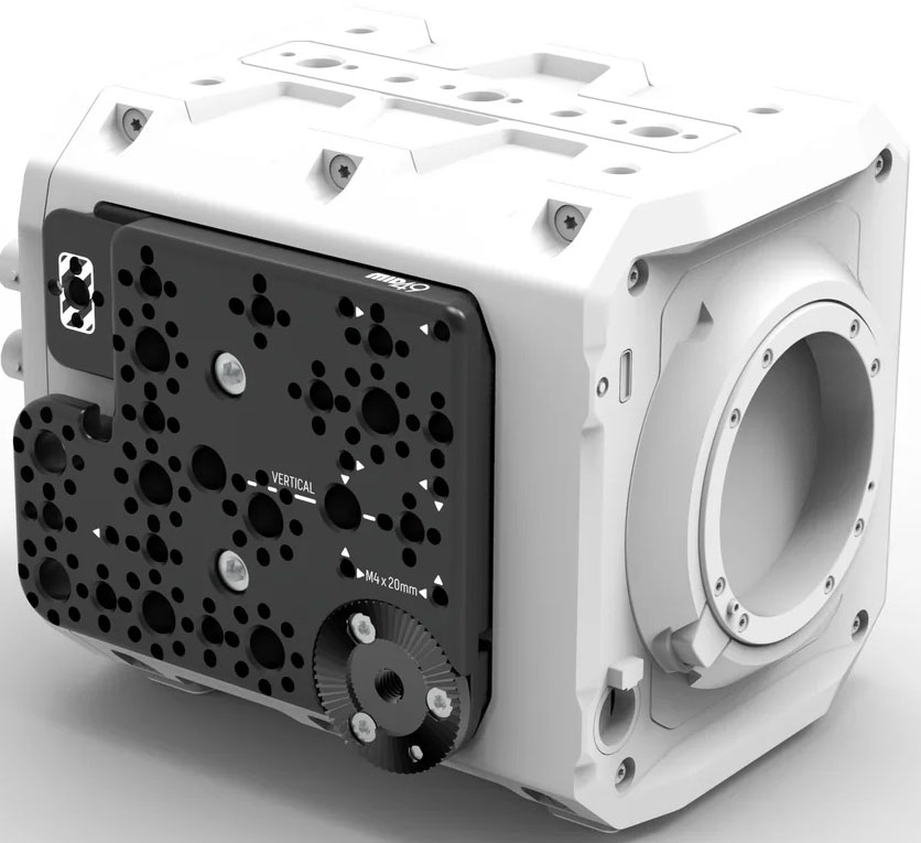 Płytka boczna (Blackmagic PYXIS) mocowana jest z boku kamery i posiada otwory 1/4-20, 3/8-16 z kołkami ustalającymi ARRI, standardową rozetę ARRI i otwory gwintowane M4x20mm. Oznaczony zestaw otworów 3/8-16 i 1/4-20 znajduje się na osi czujnika, a płytka ma odpowiednią grubość, aby zamontować kamerę pionowo na Baseline 15mm LW (Blackmagic PYXIS) i użyć prętów 15 mm na odpowiedniej wysokości obiektywu. Pasek 1/4-20 zapewnia idealne miejsce do montażu Audio Breakout AB-9 (Blackmagic PYXIS), a wpuszczone pętle kablowe z tyłu płyty bocznej umożliwiają czyste zarządzanie kablami.