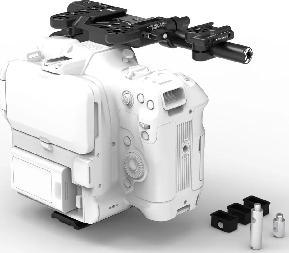 Specjalne wgłębienie 1/4-20 na końcu pręta utrzymuje Audio Breakout AB-4 (Canon C70/C80), który jest dostępny jako opcjonalny dodatek i konwertuje dwa mini XLR kamery na standardowe, pełnowymiarowe XLR. Osłona HDMI bezpiecznie zaciska kable, a przednie mocowanie obiektywu umożliwia podłączenie adapterów obiektywów innych firm, takich jak Metabones itp.