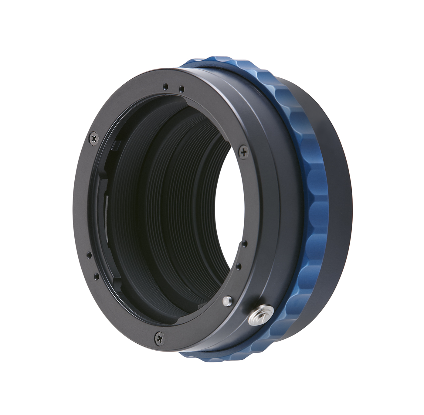 Obiektywy bez własnego pierścienia przysłony można bezstopniowo zmniejszać za pomocą niebieskiego pierścienia. Nie można jednak wybrać konkretnej wartości przysłony.
