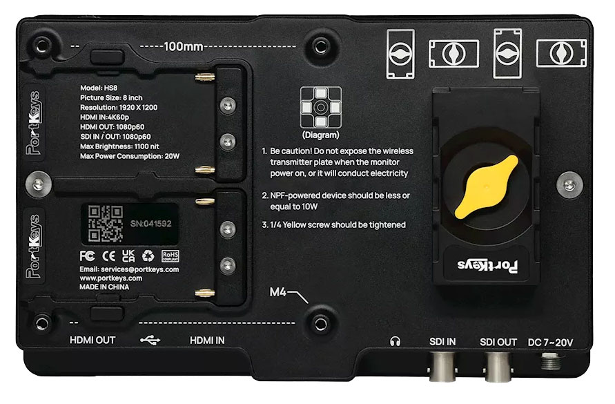 - Wbudowana atrapa akumulatora Sony NP-F z przejściem zasilania (8V/10W) do podłączenia i zasilania bezprzewodowego odbiornika wideo z tyłu HS8