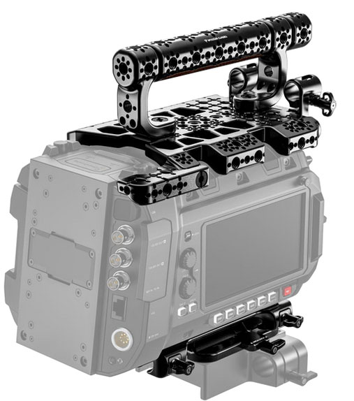 - Aby zwiększyć możliwości kamery, płyta górna podkreślająca przepływ powietrza i łączność jest przymocowana do górnej części kamery za pomocą trzech śrub ¼ "-20 wzdłuż środkowych punktów montażowych kamery. Dodatkowo, zdejmowany zacisk 15 mm Dual Rod pozwala użytkownikom na podłączenie takich elementów jak Blackmagic EVF lub dodatkowe akcesoria innych firm. Konstrukcja zawiera zdejmowane tylne przedłużenie dla dodatkowych punktów połączenia z górną płytą. Płyta górna jest kompatybilna z uchwytem Blackmagic URSA.