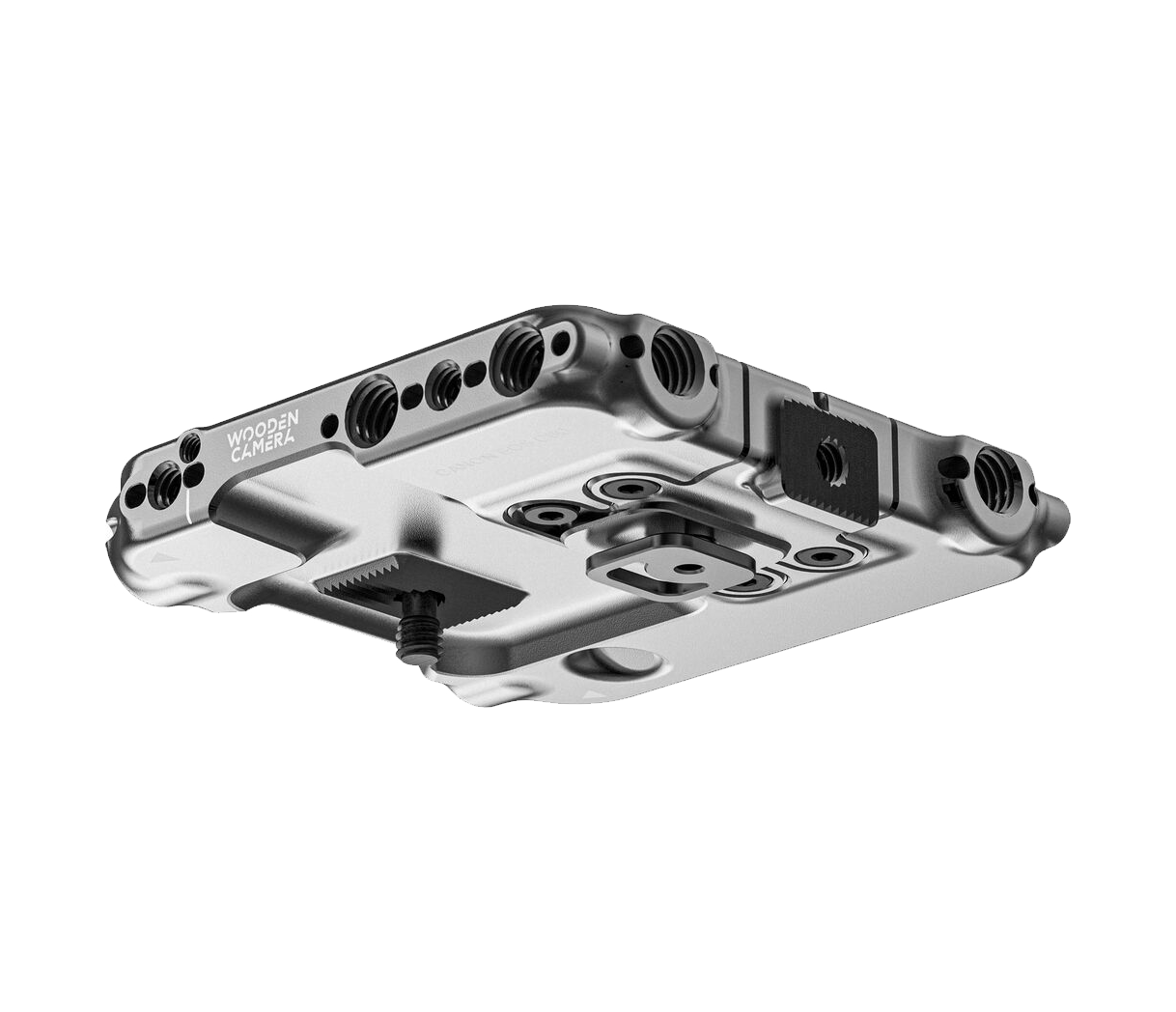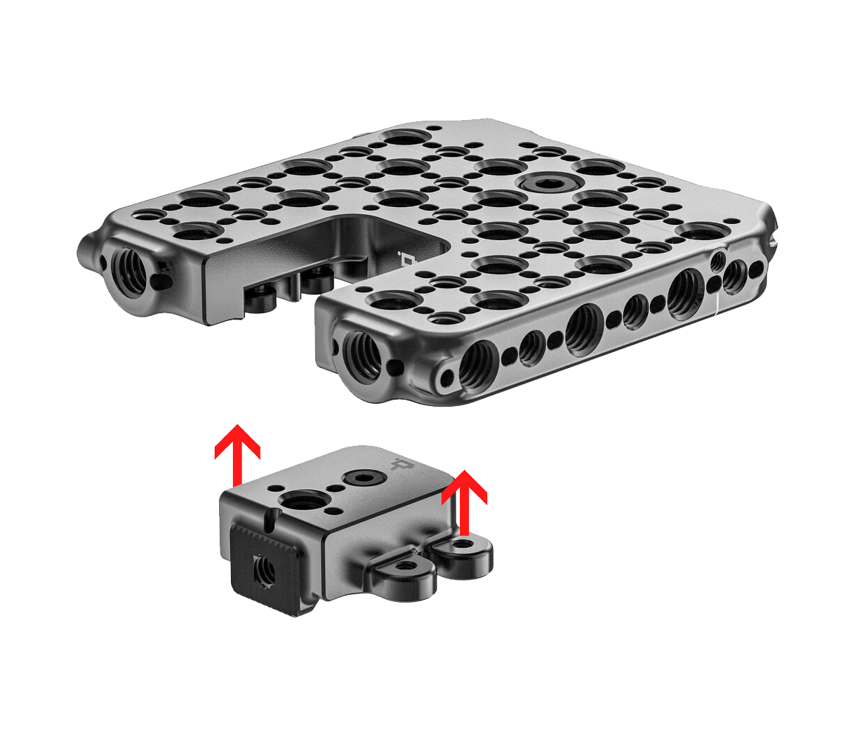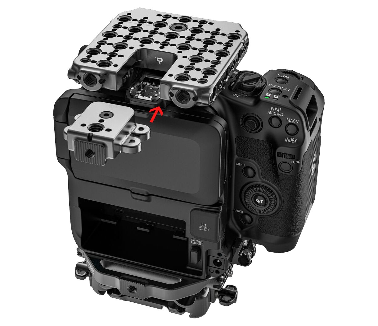 Górna płytka do Canon EOS C80 ma 2-częściową konstrukcję, która pozwala użytkownikom na usunięcie sekcji i korzystanie z gorącej stopki w aparacie. Płytka ta jest bezpiecznie montowana do górnej części aparatu za pomocą śruby 1/4"-20 i zawiera grzbiety mocujące dla dodatkowej stabilności. Gdy nie używasz gorącej stopki, druga część górnej płyty jest bezpiecznie przymocowana do kamery za pomocą zimnej stopki. Z tyłu górnej płyty znajduje się punkt montażowy do zamocowania Battery Slide Pro, grzbiety w tym punkcie zwiększają stabilność, zapobiegając skręcaniu się płyty.