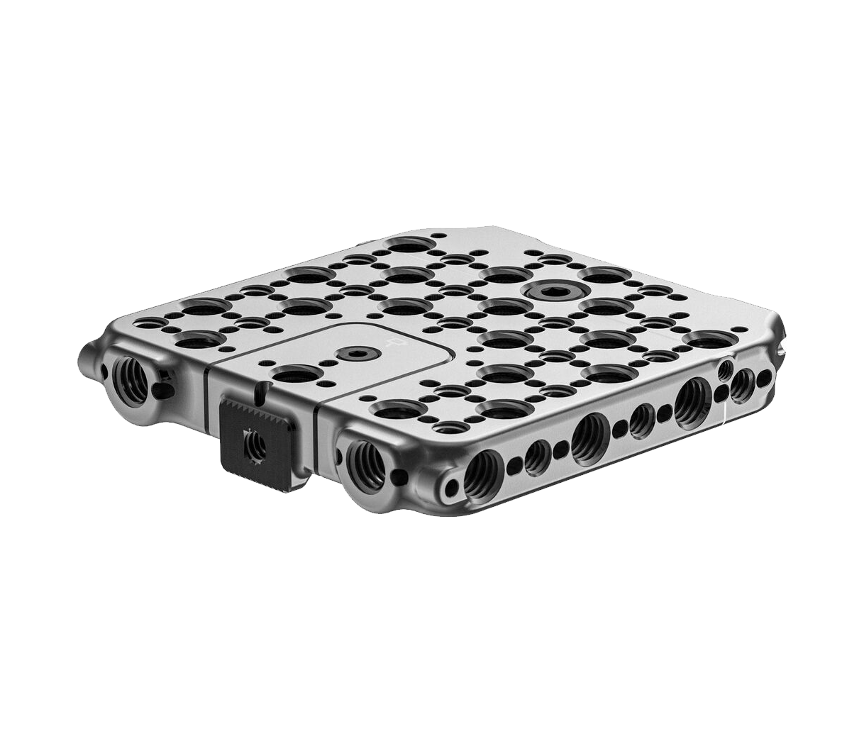 Konstrukcja zawiera wycięcie, aby utrzymać hak na taśmę w oryginalnym miejscu, ale jeśli chcesz go usunąć, projekt zawiera również opcje montażu haka na taśmę po lewej lub prawej stronie płytki. Wzdłuż górnej płyty i po bokach znajduje się wiele punktów montażowych do mocowania akcesoriów. Dwa punkty montażowe 3/8"-16 są symetryczne z przodu i z tyłu, umożliwiając zamocowanie Top Plate Dual Rod Clamp i akcesoriów opartych na prętach 15 mm na górnej płycie.