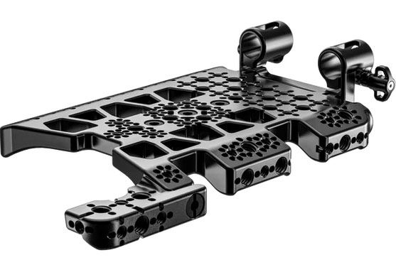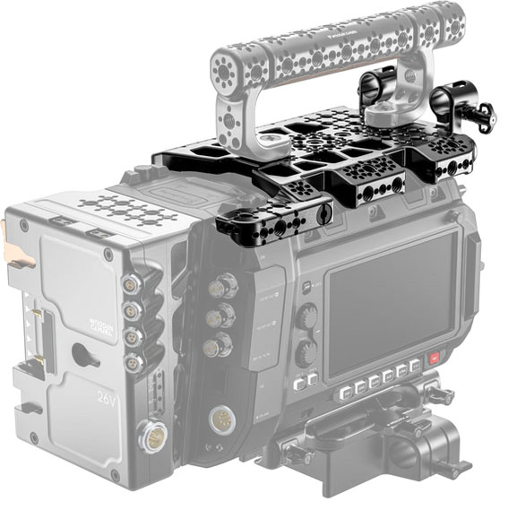 System Top Plate zaprojektowany dla Blackmagic URSA Cine 12K/17K zawiera otwarte porty podkreślające przepływ powietrza. Obejmuje on górną płytkę, przedni podwójny zacisk pręta i blok przedłużający górną płytkę. System ten można bezpiecznie zamontować na górnej części kamery za pomocą trzech śrub 1/4"-20 na środku kamery i dodaje wiele punktów montażowych 1/4"-20 i 3/8"-16 na górze i po bokach płyty.