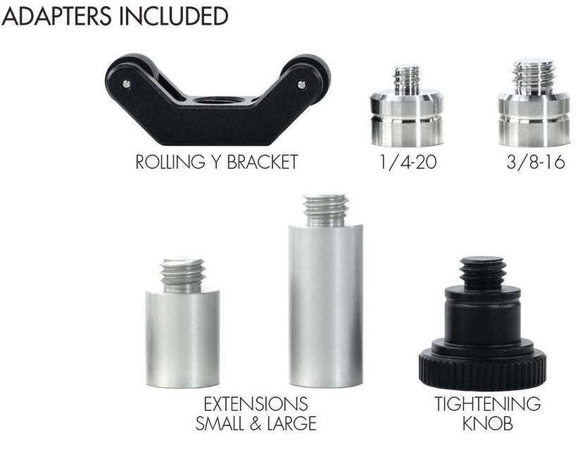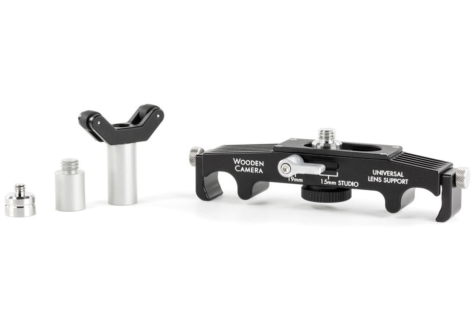 Uniwersalny wspornik obiektywu ( 19mm/15mm Studio) obsługuje ciężkie obiektywy przy użyciu drążków studyjnych 19 mm lub 15 mm. Konwertowalny między oboma standardami prętów studyjnych. Odblokuj śrubę radełkowaną, aby przejść od wyśrodkowanego wspornika 19 mm do przesunięcia studyjnego 15 mm. Zawiera nasadkę 1/4-20 do mocowania do kołnierzy statywów i niektórych obiektywów kinowych, 3/8-16 do mocowania do większości obiektywów kinowych ze standardową stopką podpierającą oraz obrotowy wspornik Y do mocowania do obiektywów typu DSLR, w przypadku których stopka podpierająca nie jest dostępna. Gumowe kółka umożliwiają również pozycjonowanie pod obracającymi się tubusami ostrości, gdy jest to konieczne. Szybki montaż jest możliwy poprzez poluzowanie śrub radełkowanych. Pionowy słupek może poruszać się na boki, aby pomieścić przekrzywione płyty bazowe. Regulacja wysokości umożliwia dopasowanie do każdej średnicy tubusu obiektywu.